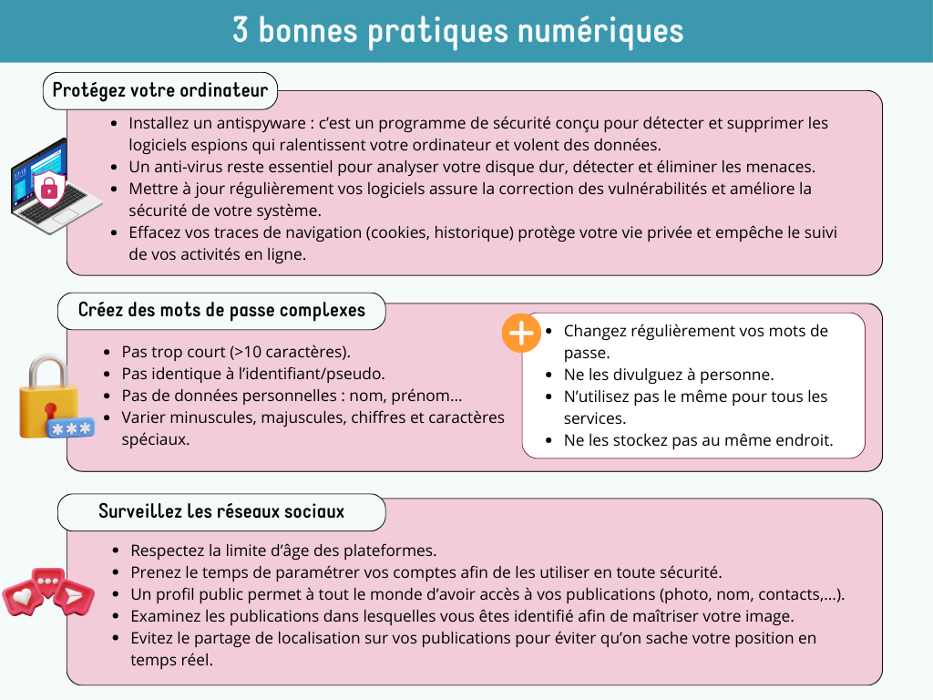 Pour éviter de devenir victime, la prévention repose sur quelques bonnes pratiques numériques simples.